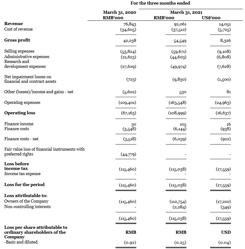 非国际财务报告准则下(Non-IFRS)的净亏损指扣除股权激励费用、优先股公允价值变动损失以及优先股其他损失后的当期净亏损。2021年第一季度Non-IFRS的净亏损为1.058亿元人民币(16.1百万美元),去年同期为65.6百万元人民币。