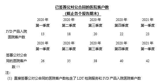 2021年第一季度诊断和监测业务收入为87.1百万元人民币(13.3百万美元),2020年同期收入为66.8百万元人民币,同比增长30.4%,这主要得益于LDT检测服务。