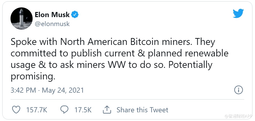 根据Coindesk的数据,比特币的交易价格在38,074美元左右时,马斯克在推特上发表消息称:“与北美的比特币矿工进行了交谈,矿工承诺发布当前和计划中的可再生能源使用情况。”