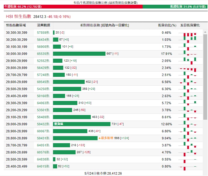 法兴恒指牛熊证街货分布图中的数据显示,熊证街货重货区在29000-29099区间,该区间最新熊证数量为731张,较上一交易日减少47张;最多新增在28800-28899区间,该区间最新熊证数量为566张,较上一交易日增加124张。