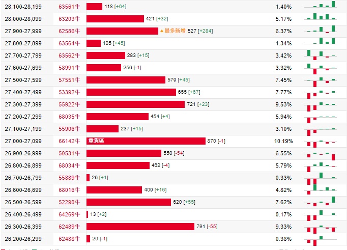 牛证街货重货区在27000-27099区间,该区间最新牛证数量为870张,较上一交易日减少1张;最多新增在27900-27999区间,该区间最新牛证数量为527张,较上一交易日增加284张。