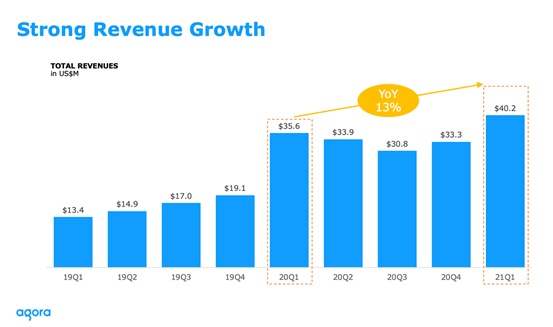 智通财经APP获悉,北京时间5月25日,全球实时互动云服务商声网Agora(API.US)发布了截至2021年3月31日的第一季度财报。财报显示,2021年Q1声网实现营收4023万美元,去年同期为3560万美元,同比增长13%;2020年Q4为3330万美元,环比增长21%,创历史新高。