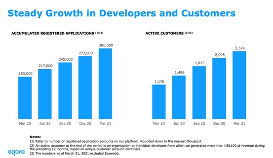 客户规模方面,截至2021年3月31日,声网全球注册应用超30.6万个,同比增长67%;活跃客户数量达2324个,同比增长98%。