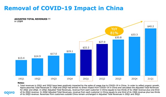 如果剔除2020年Q1-Q2新冠疫情爆发这一特殊时期在中国市场的短期影响,声网 Q1营收则实现81%的同比增长,并连续8个季度保持稳健增长。