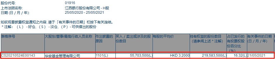 智通财经APP获悉,香港联交所最新资料显示,5月21日,华安基金管理有限公司增持江西银行(01916)5570.35万股,每股作价3.20港元,总金额约为1.78亿港元。增持后最新持股数目约为2.20亿股,最新持股比例为16.32%。