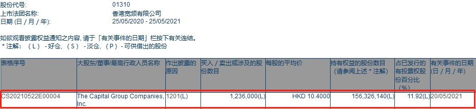 智通财经APP获悉,香港联交所最新资料显示,5月20日,美国资本集团减持香港宽频(01310)123.6万股,每股作价10.40港元,总金额为1285.44万港元。减持后最新持股数目约为1.56亿股,最新持股比例为11.92%。