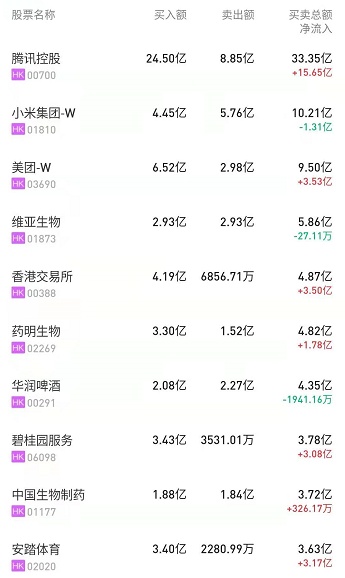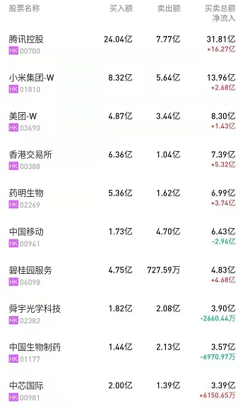 北水净买入最多的个股是腾讯(00700)、港交所(00388)、碧桂园服务(06098)。北水净卖出最多的个股是中移动(00941)、中生制药(01177)、舜宇光学(02382)。