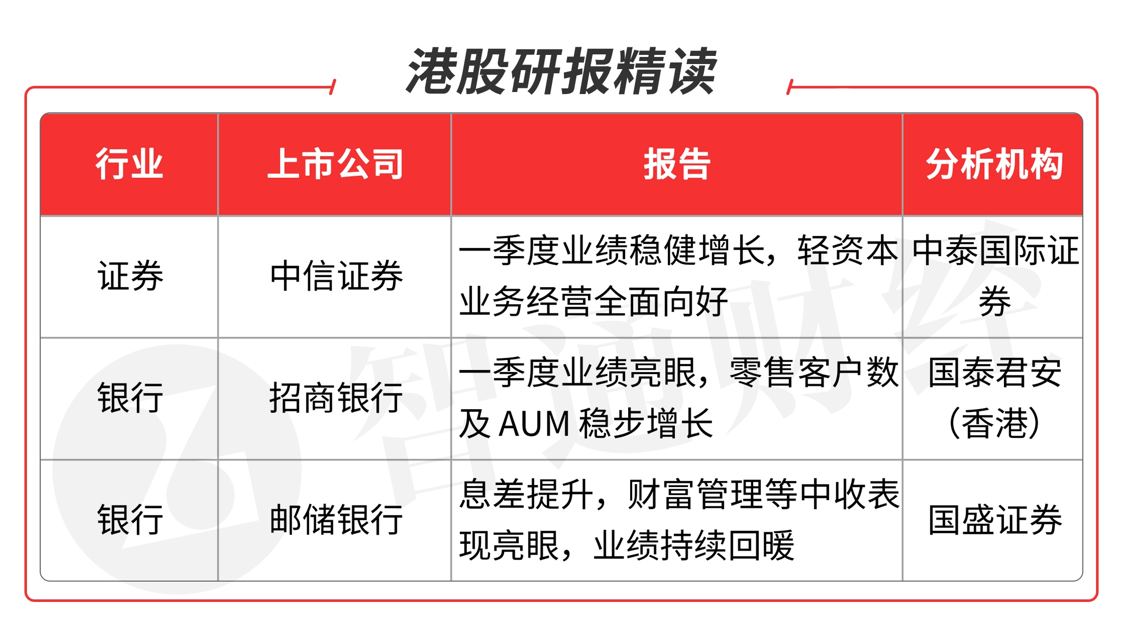 2、招商银行(03968):手续费及佣金大幅增长。一季度末,公司实现归属于该行股东的净利润320.15亿元,同比增长15.18%(主要由于净手续费及佣金收入272.02亿元,同比增23.30%);营业净收入848.44亿元,同比增长11.09%。实现净利息收入495.24亿元,同比增长8.23%,在营业净收入中占比58.37%。