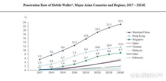 移动钱包的普及率通常被用作数字金融服务行业发展阶段的关键指标。2020年,中国大陆是亚洲手机钱包普及率最高的地区,为12.5%。尽管其他亚洲国家和地区(例如香港和新加坡)的手机钱包普及率要低得多,但近年来这些国家和地区亦同步实现了迅速增长。