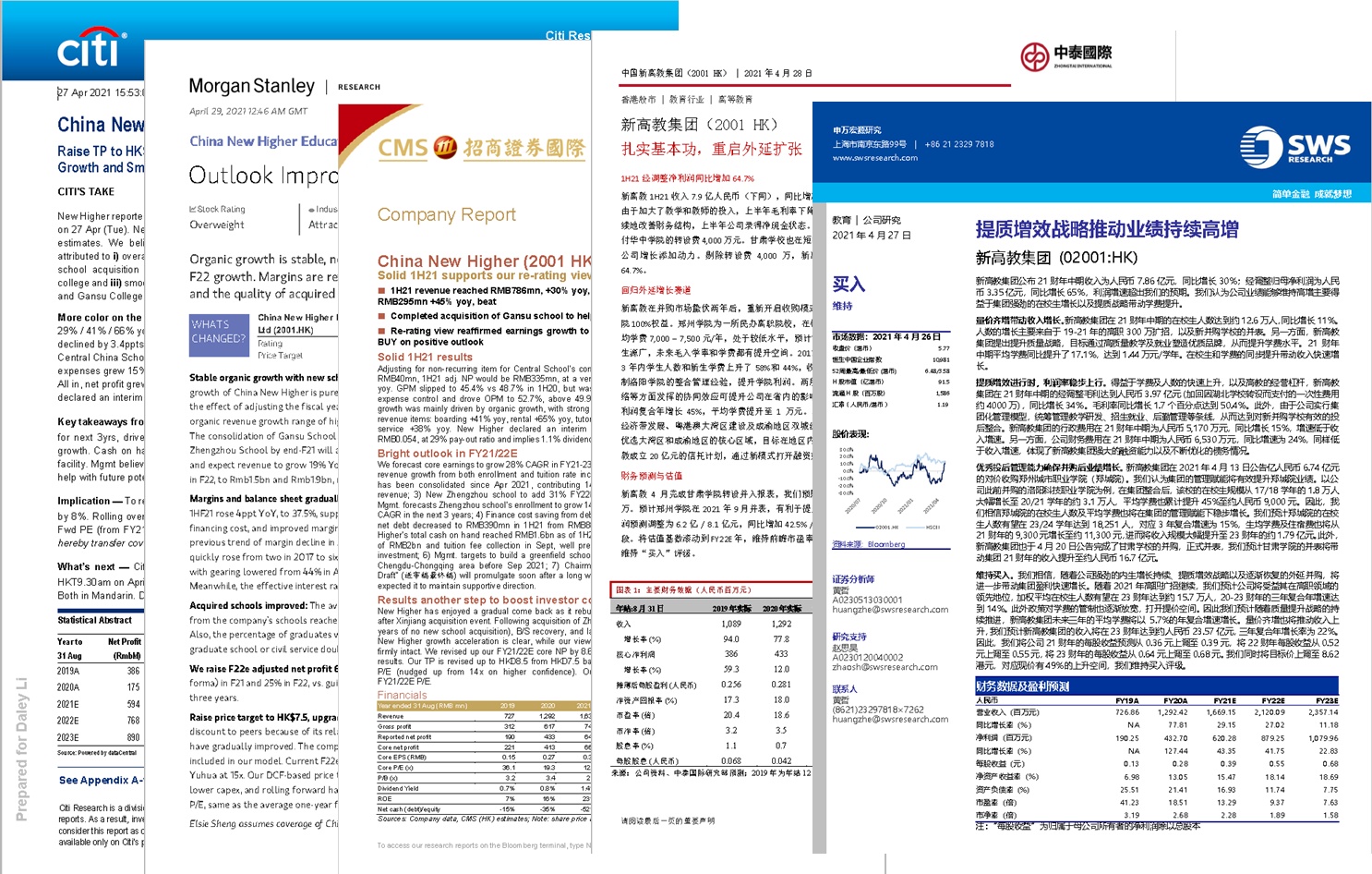 新高教集团(02001)近期公布2021财年中期业绩后,海内外多家券商包括大摩、花旗、UBS、CLSA、中金、申万宏源、中泰国际、招商证券(国际)、兴业证券、中国银河国际等十余家机构给予“买入”和“增持”评级,看好新高教集团未来发展。其中,申万宏源最高上调新高教集团目标价至8.62港元,认为集团提质增效战略将推动业绩持续高增长。