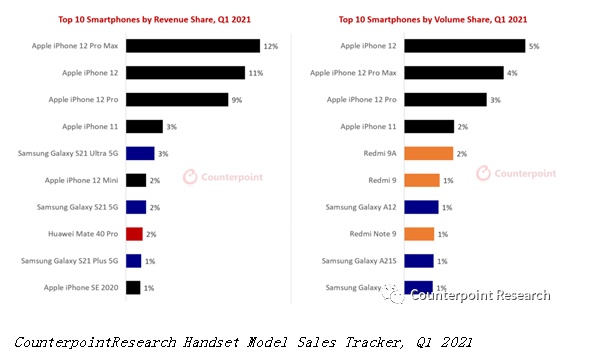Counterpoint Research 2021年第一季度的全球手机跟踪数据显示,按销量份额和收入份额计算,苹果(AAPL.US)iPhone都是2021年第一季度最畅销的机型。