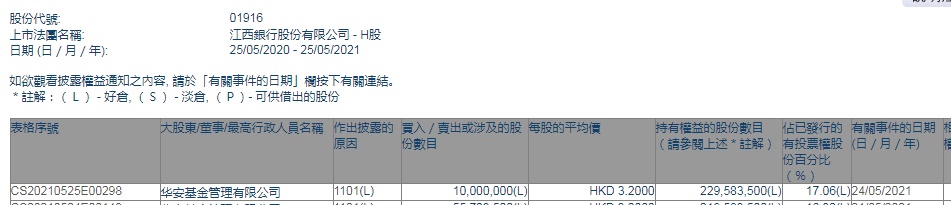 智通财经APP获悉,香港联交所最新资料显示,5月24日,华安基金管理有限公司增持江西银行股份有限公司(01916)1000万股,每股作价3.2港元,总金额为3200万港元。增持后最新持股数目约为2.296亿股,最新持股比例为17.06%。