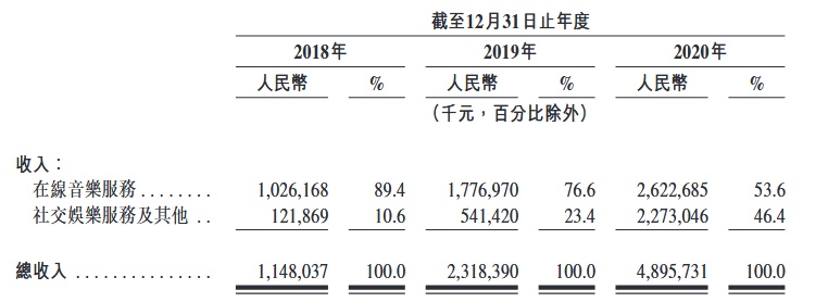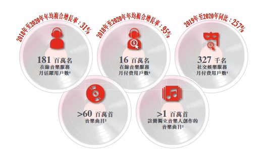 招股书透露,于往绩记录期间,以用户群和内容储备计,该公司经历快速增长:在线音乐服务月活跃用户数为1.81亿名,2018年至2020年年均复合增长率为31%;在线音乐服务月付费用户数为1600万名,2018年至2020年年均复合增长率为95%;社交娱乐服务月付费用户数为32.7万名,2019年至2020年同比增长257%;音乐曲目超6000万首;注册独立音乐人创作的音乐曲目超100万首。
