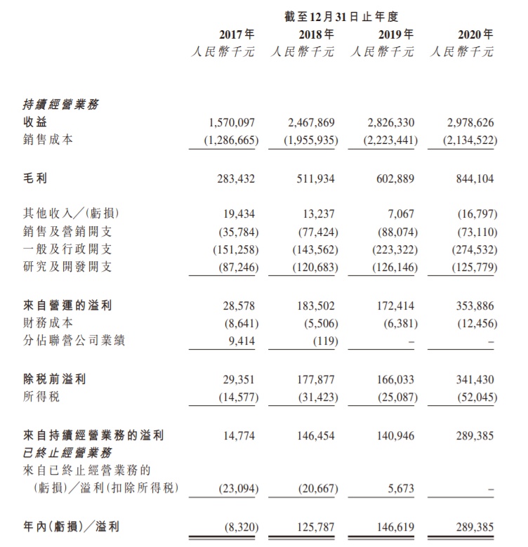 截至2017年、2018年、2019年及2020年12月31日止年度,公司来自持续经营业务的收益分别约为15.70亿元、24.68亿元、28.26亿元及29.79亿元。年内溢利方面,2017年亏损832万元,2018年至2020年净利分别为1.26亿元、1.47亿元及2.89亿元。