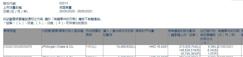 智通财经APP获悉,香港联交所最新资料显示,5月21日,摩根大通增持微盟集团(02013)约1448.96万股,每股作价16.4281港元,总金额约为2.38亿港元。增持后最新持股数目约为2.13亿股,最新持股比例为9.36%。