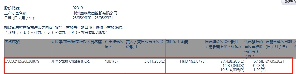 智通财经APP获悉,香港联交所最新资料显示,5月21日,摩根大通增持申洲国际(02313)约361.12万股,每股作价192.8778港元,总金额约为6.97亿港元。增持后最新持股数目约为7742.83万股,最新持股比例为5.15%。