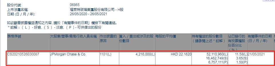 智通财经APP获悉,香港联交所最新资料显示,5月21日,摩根大通增持福莱特玻璃(06865)421.6万股,每股作价22.162港元,总金额约为9343.50万港元。增持后最新持股数目约为5211.10万股,最新持股比例为11.58%。