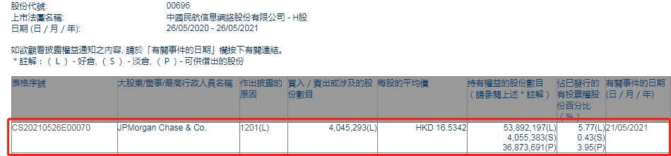 智通财经APP获悉,香港联交所最新资料显示,5月21日,摩根大通减持中国民航信息网络(00696)约404.53万股,每股作价16.5342港元,总金额约为6688.57万港元。减持后最新持股数目约为5389.22万股,最新持股比例为5.77%。
