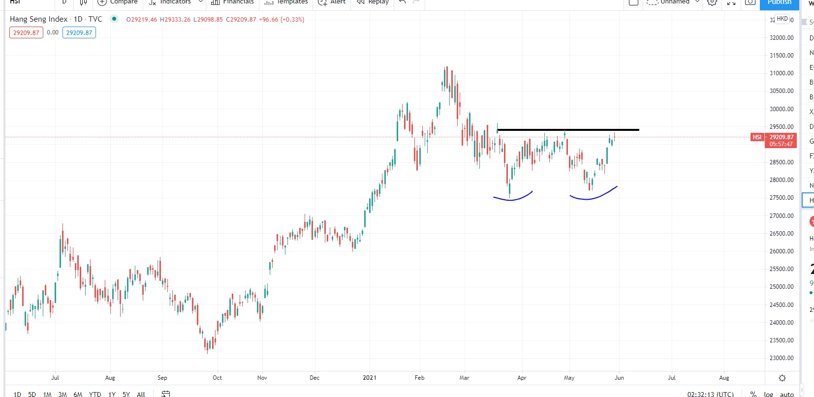 同时恒生指数在日线图中出现双底走势,目前上方仍受制于29300点-29400点的阻力,一旦升穿有机会挑战29700的阻力。而由于近日股市受MSCI季度调整及恒指成份股调整影响,但是在六月初至六月中有一个周期,大家要留意这周期带来是利多还是压力。