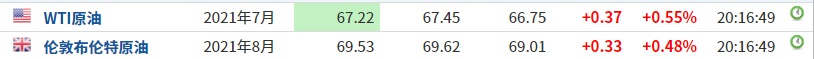 截至发稿,WTI原油涨0.55%,报67.22美元/桶。布伦特原油涨0.48%,报69.53美元/桶。