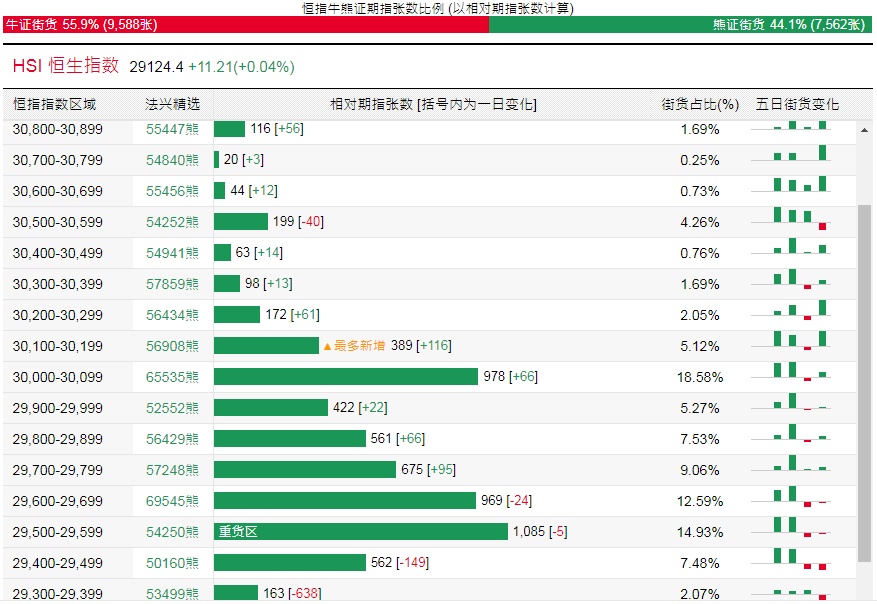 法兴恒指牛熊证街货分布图中的数据显示,熊证街货重货区在29500-29599区间,该区间最新熊证数量为1085张,较上一交易日减少5张;最多新增在30100-30199区间,该区间最新熊证数量为389张,较上一交易日增加116张。