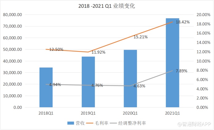 2021年一季度,小米总收入和经调整净利润均创单季度历史新高,大幅超出市场预期。与此同时,公司整体毛利率达18.4%,也远高出市场预期的15.3%;经调整净利润率达7.89%,同比增长3.27个百分点。