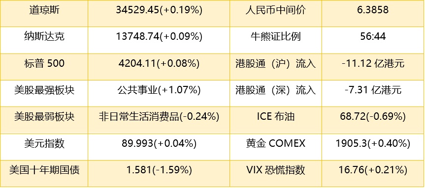 1、 上周五美股道琼斯指数涨65.73点,涨幅0.19%,报34530.37点;标普500指数涨4.42点,涨幅0.11%,报4205.30点;纳斯达克综合指数涨12.46点,涨幅0.09%,报13748.74点。港股ADR指数上涨,按比例计算,收报29287点,涨163.45点或0.56%。