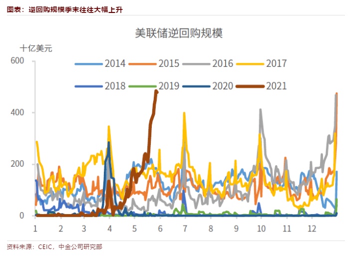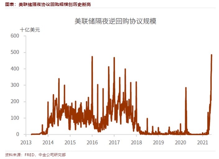 6月份隔夜逆回购规模可能进一步上升,但我们预计不大会给QE减量路径造成显著影响。从历史上看,往往美联储隔夜逆回购协议规模在季度末大幅上升——由于银行在季度末需要满足监管要求,所以会降低其资产负债表风险资产进而更多使用美联储隔夜逆回购这一“无风险”工具。按季节性规律,6月末隔夜逆回购规模存在进一步上升的可能。但是目前财政存款余额已经大幅下降,财政资金进一步提供流动性的空间有限。我们预计,美联储隔夜逆回购的大幅增长不会给美联储QE减量路径造成显著影响。正如我们在海外宏观周报《五月非农:决定Taper的关键变量》中所分析,美联储QE减量(taper)的决策仍然主要取决于经济基本面的边际变化,具体来说,就业市场的修复情况是美联储决定何时开始taper的重要变量。