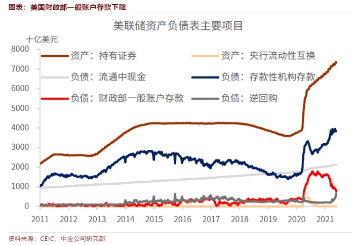 美国财政部在美联储的一般账户(TGA)存款骤降和近期隔夜逆回购激增,美元流动性泛滥,市场含义何在?我们预计流动性将于8、9月边际收紧,或将对高估值风险资产带来一定压力。但在美联储开始taper前(我们预计今年底),流动性总量仍相对充裕,伴随全球复苏深化及通胀抬升,未来几个月再通胀交易或仍将持续。随着市场对通胀愈发敏感(尤其从需求型通胀过渡到供给型通胀),提示关注流动性边际收紧将加剧再通胀交易下的资产波动。