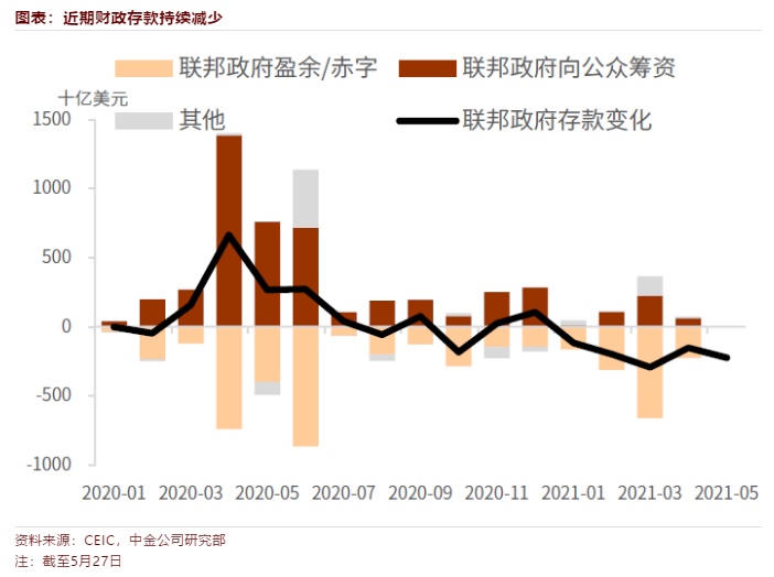 美国3月开启新一轮财政刺激,叠加4-5月政府融资减缓,导致财政存款快速下降。首先,由于新一轮财政刺激扩大了联邦政府赤字,今年3月份联邦政府赤字扩大至6596亿美元,仅次于去年4月和6月高点。其次,4月以来政府债务融资速度减慢,5月以来联邦政府公众债务余额出现负增长。财政部一般账户存款连续5个月下降,从去年底的1.7万亿美元下降到5月27日7460亿美元。