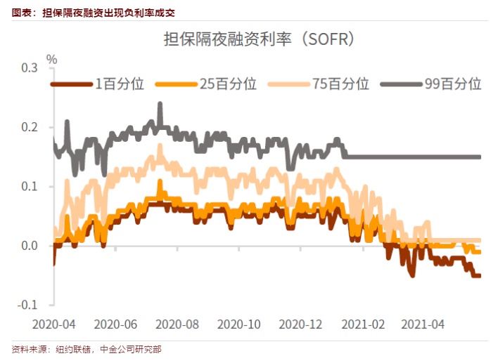 大规模财政资金的释放为金融体系带来大量流动性。2月底以来,美国国债质押回购市场出现了一定比例的负利率成交。由于回购市场出现负利率,而美联储提供的隔夜逆回购协议利率为零,所以银行宁愿通过逆回购将一部分流动性返还给美联储。