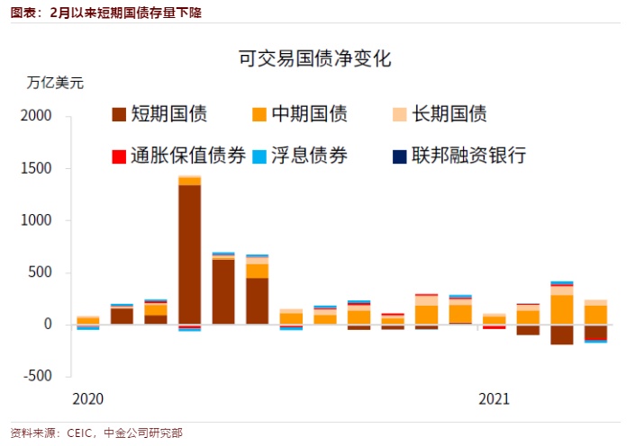 短期国债发行量下降,让金融体系缺失了一个吸收短期流动性的重要方式。2020年2季度联邦政府发行了大量短期国债为联邦政府赤字融资,而短期国债是短期资金的一个重要投资渠道。但是随着财政部发行的短期国债占比逐步下降,2月份以来短期国债绝对量出现负增长。这让金融体系少了一个重要的吸收短期流动性的渠道。由于财政部计划进一步降低短期国债发行比例,该趋势短期内可能不会改变。