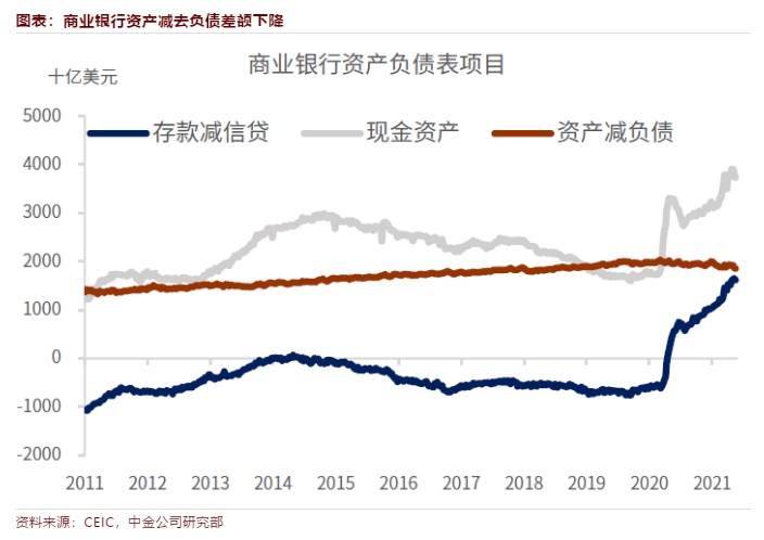 银行资本金约束也是造成金融体系流动性淤积的因素。美联储开启新一轮QE以来,商业银行贷款增长慢于存款,形成了大量现金资产。但是商业银行资产减去负债之后的余额却出现了一定程度的下降。商业银行面临的资本金约束限制了信贷扩张,也是造成流动性淤积于金融体系的另一方面的原因。
