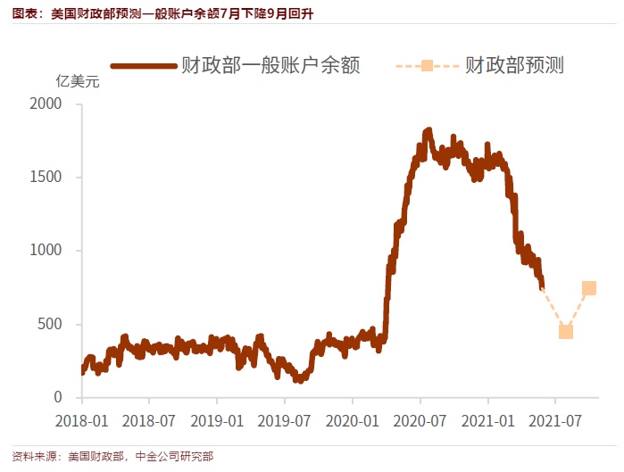 7月底之前财政资金可能继续为市场提供流动性,但3季度可能出现拐点。根据美国财政部最新的估计,7月底 “债务上限”豁免到期时,财政部一般账户余额将降低至大约4500亿美元;之后,随着债务发行,9月末将回升至大约7500亿美元(除非美国两党在债务上限的问题上有新的变化而继续延长豁免债务上限的政策)。这意味着8、9月份财政存款增长将给流动性带来3000亿美元的紧缩(相当于两个半月的QE规模),恐将成为美元流动性的一个重要拐点——美联储尚未开始QE缩减,而流动性边际上已经开始收紧。