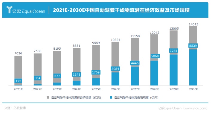 亿欧智库测算,2030年中国自动驾驶干线物流潜在经济效益将达14045亿元,市场规模将达8539亿元。自动驾驶干线物流赛道近万亿级市场规模吸引着科技公司、主机厂、物流平台方等多方共同掘金。