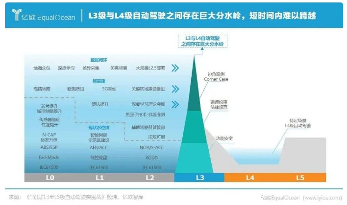 从技术层面考虑,自动驾驶系统演进过程中,由于功能安全、道德约束与法律规范以及层出不穷的边角案例,L3级与L4级自动驾驶之间存在巨大分水岭,短时间内难以跨越。