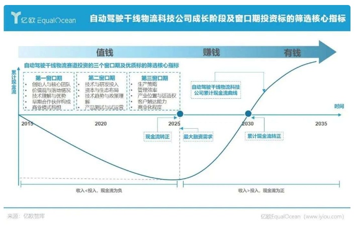 基于对自动驾驶干线物流科技公司成长阶段以及赛道投资的分析,亿欧智库判断,当前自动驾驶干线物流赛道投资第三窗口期即将开启,生产策略、管理效率、产业位置与话语权、客户触达能力与商业化程度,将成为第三窗口期优质投资标的筛选的核心指标。