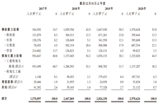 2017年-2020年,森松国际实现收入15.7亿元、24.68亿元、28.26亿元、29.79亿元,增速呈现逐年趋缓态势。其中,大部分收入来源于传统压力设备、模块化压力设备两大板块。