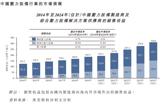 而在一系列政策支持、下游应用需求增长以及外国客户对中国压力设备质量的进一步认可下,预期中国压力设备制造商及综合压力设备解决方案供应商的销售收益未来将稳步增长至2024年时的3100亿元,2019年-2024年的复合年增长率约为10.9%。对比来看,接下来几年压力设备行业的增速将继续上升。