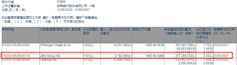 智通财经APP获悉,香港联交所最新资料显示,5月25日,瑞银增持招商银行(03968)210.2万股,每股作价69.5069港元,总金额约为1.46亿港元。增持后最新持股数目约为2.77亿股,最新持股比例为6.04%。