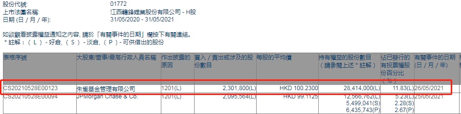 智通财经APP获悉,香港联交所最新资料显示,5月26日,朱雀基金减持赣锋锂业(01772)230.18万股,每股作价100.23港元,总金额约为2.31亿港元。减持后最新持股数目为2841.4万股,最新持股比例为11.83%。