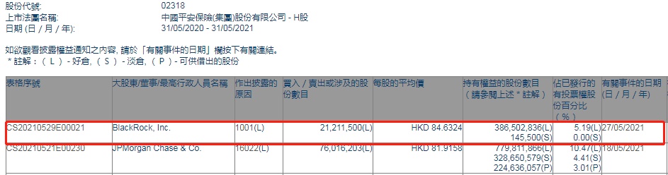 智通财经APP获悉,香港联交所最新资料显示,5月27日,贝莱德增持中国平安(02318)2121.15万股,每股作价84.6324港元,总金额约为17.95亿港元。增持后最新持股数目约为3.87亿股,最新持股比例为5.19%。