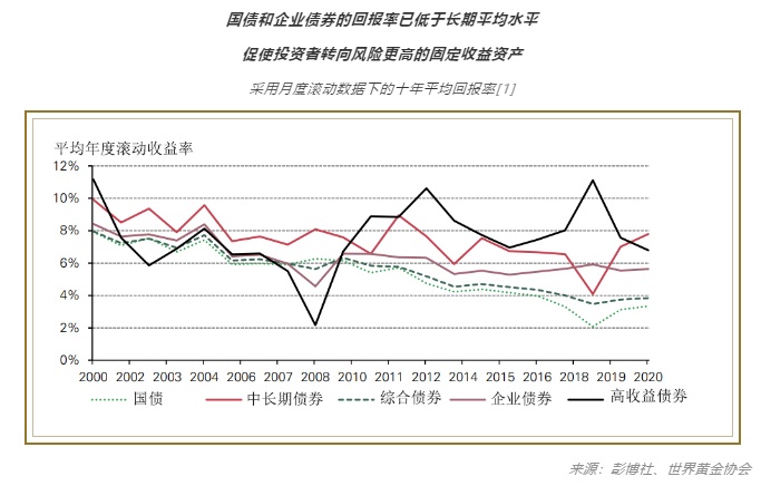 长期的低利率导致了资产配置策略的结构性转变,因为债券已经很难为投资者提供像过去那样的回报或保护。因此,一些投资者已经减少了债券的配置,转而选择其他资产,或者将债券风险转移到信贷曲线的更远处。两种做法都可以提供更高的回报,但也会带来更大的风险。这就为黄金提供了一个机会,以减轻投资者采取此类策略的风险。