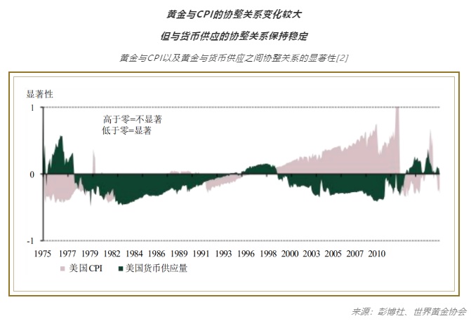 黄金与货币供应的关系远远强于与CPI通胀的关系,这意味着黄金不仅仅针对商品与服务价格水平的上涨提供保护,还能保护投资者免受货币贬值和更强货币流动性可能带来的风险。由于货币供应量的增长速度比CPI要快,这就为黄金在一段时间内保持正增长的预期提供了支持。