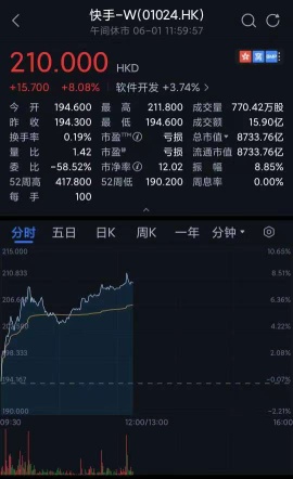 截至6月1日中午收盘,快手每股报210元,较昨日收盘价劲增15.7元,涨超8%。盘间一度摸高至211.8元,涨幅逼近9%。