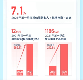 5月24日,快手科技(1024.HK)发布2021年第一季度财报,电商业务增长迅速。其中电商交易总额同比增长219.8%达到人民币1186亿元,私域对电商交易总额的贡献远超公域。以电商为主的其他服务收入板块,同比大幅增长589.1%至人民币12亿元。