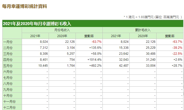 澳门今年1-5月份幸运博彩毛收入424.87亿澳门元,同比增长28.7%。