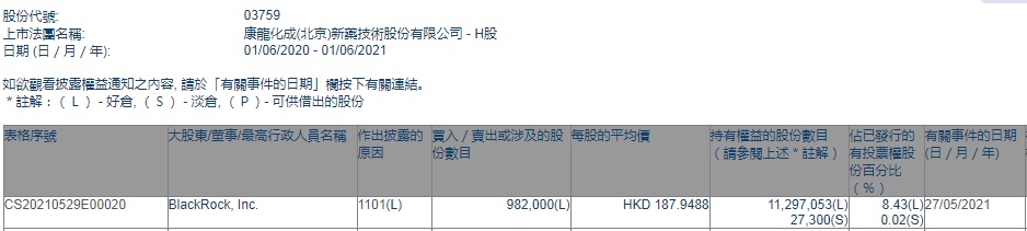 智通财经APP获悉,香港联交所最新资料显示,5月27日,贝莱德增持康龙化成(03759)98.2万股,每股作价187.95港元,总金额约为1.85亿港元。增持后最新持股数目约为1129.7万股,最新持股比例为8.43%。