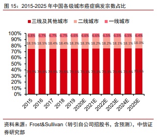 从患病人群的地区分布来看,2019年中国一线城市癌症病发宗数占比仅为6.6%,二线城市占比18.3%,三线及其他城市占比则高达75. 1%,由此可见我们低线城市诊疗资源需求相对更为迫切。