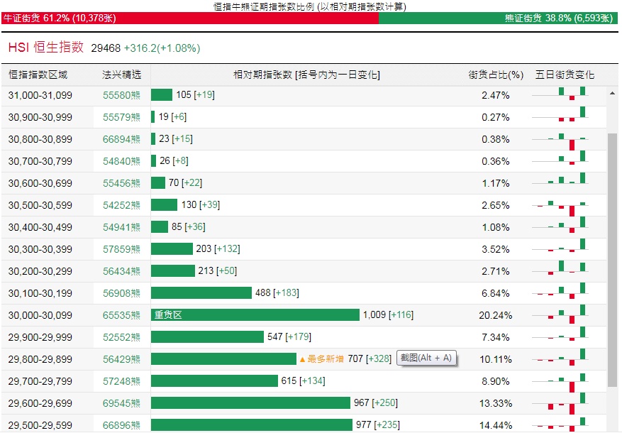 法兴恒指牛熊证街货分布图中的数据显示,熊证街货重货区在30000-30099区间,该区间最新熊证数量为1009张,较上一交易日增加116张;最多新增在29800-29899区间,该区间最新熊证数量为707张,较上一交易日增加328张。